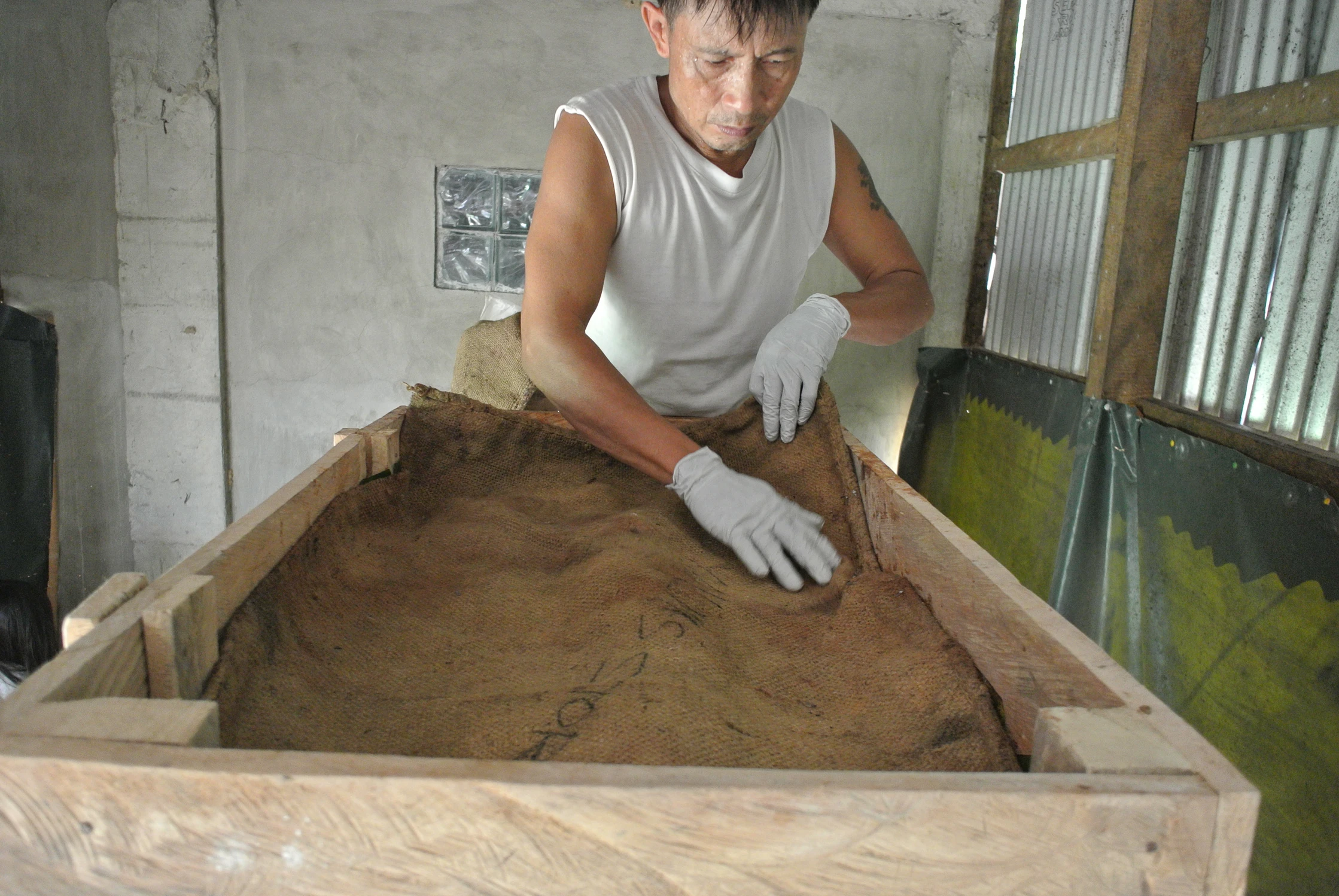 The anaerobic stage of cacao fermentation usually lasts for about 5 days. First, we drain the excess juice from the beans that are covered with mucilage. This process takes four hours. After that, we place the beans in the first fermentation box. We covered the fermentation box with banana leaves and juice sack and let it stay in the tightly covered box for three days. During this time, we place a thermometer to monitor the heat. The temperature of the beans needs to be kept at about 46°F (8°C). If the temperature gets too high, the bacteria will die and the fermentation process will come to a halt.