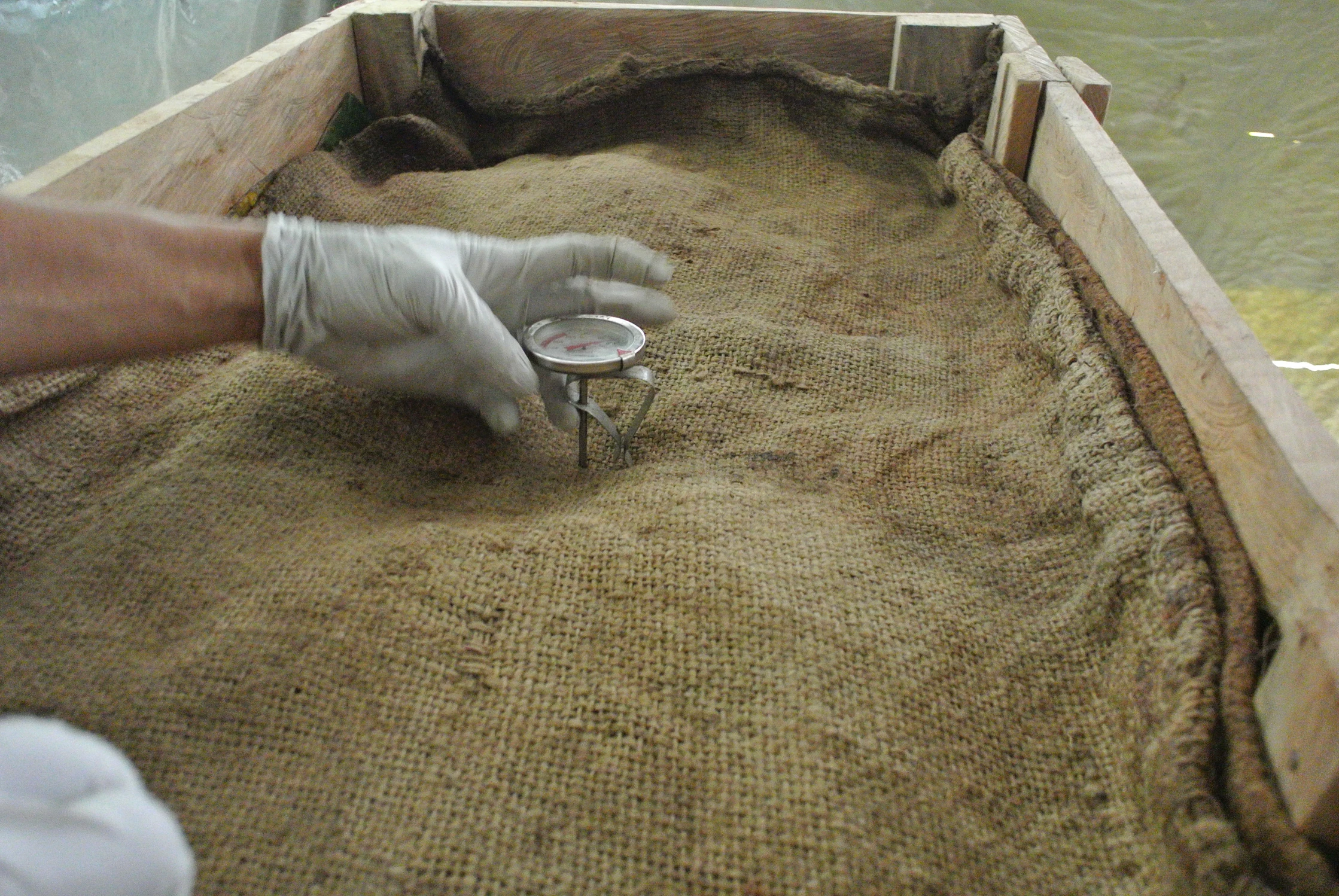 The anaerobic stage of cacao fermentation usually lasts for about 5 days. First, we drain the excess juice from the beans that are covered with mucilage. This process takes four hours. After that, we place the beans in the first fermentation box. We covered the fermentation box with banana leaves and juice sack and let it stay in the tightly covered box for three days. During this time, we place a thermometer to monitor the heat. The temperature of the beans needs to be kept at about 46°F (8°C). If the temperature gets too high, the bacteria will die and the fermentation process will come to a halt.