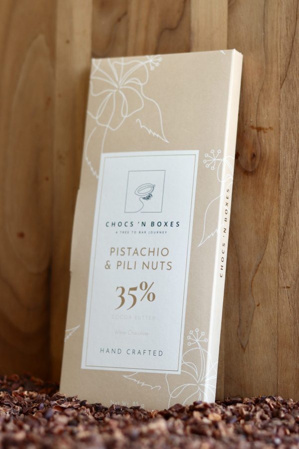 Indulge in the exquisite taste of our White Chocolate Pistachio Bar, a culinary masterpiece that marries the creamy richness of 35% white chocolate with the nutty crunch of pistachios. Carefully handcrafted, this bar promises a sensory delight with every bite. Sourced ethically from the Bicol region, our pistachio and pili nuts ensure a guilt-free indulgence. Perfectly sized at 85g, it’s ideal for those moments when you crave a sweet yet sophisticated treat.